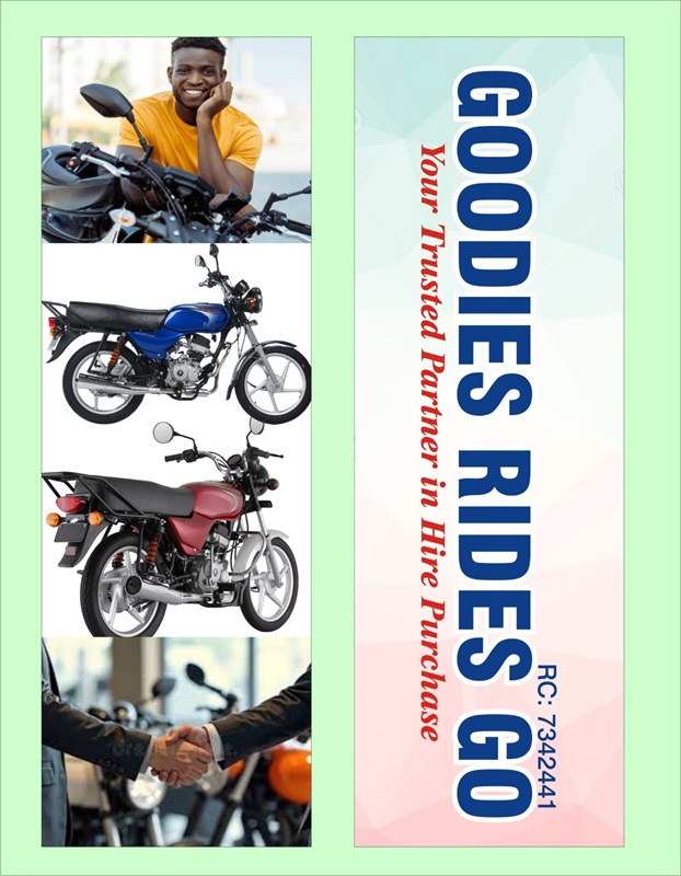 GOODIES RIDES GO INT'L LTD is a leading hire purchase and asset financing company committed to empowering individuals, entrepreneurs, and small businesses across Nigeria. We specialize in providing flexible, affordable, and transparent financing solutions for motorcycles, tricycles, vehicles, and other income-generating assets.